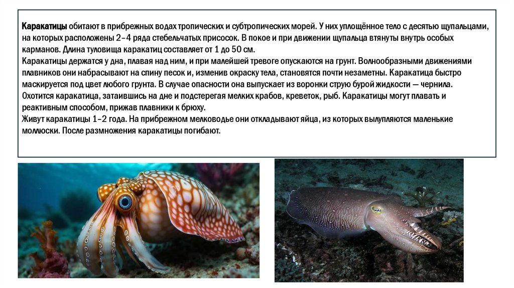 Каракатицы обитают в прибрежных водах тропических и субтропических морей. У них уплощённое тело с десятью щупальцами,на которых расположены 2–4 ряда стебельчатых присосок. В покое и при движении щупальца втянуты внутрь особых