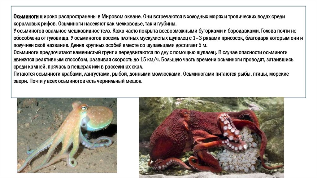 обособлена от туловища. У осьминогов восемь плотных мускулистых щупалец с 1–3 рядами присосок, благодаря которым они и