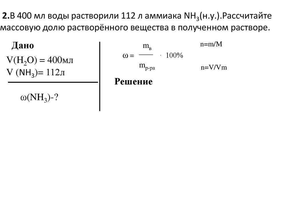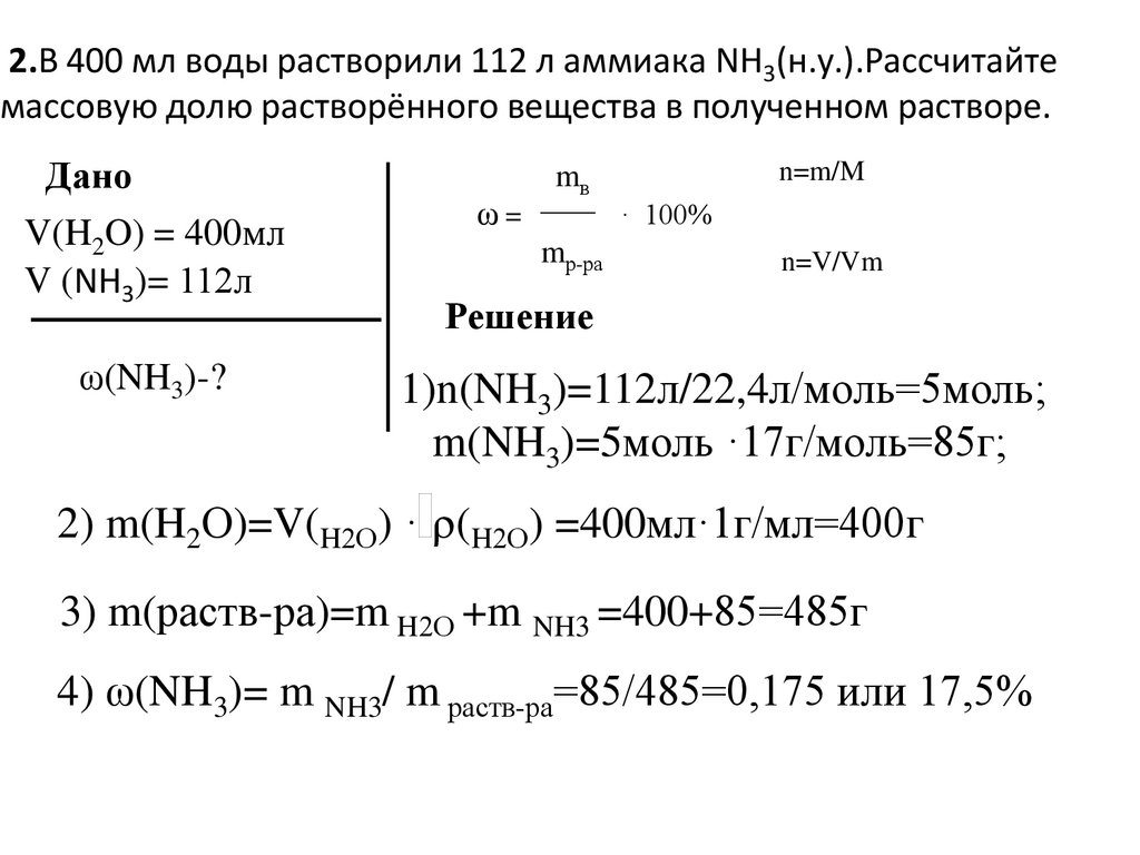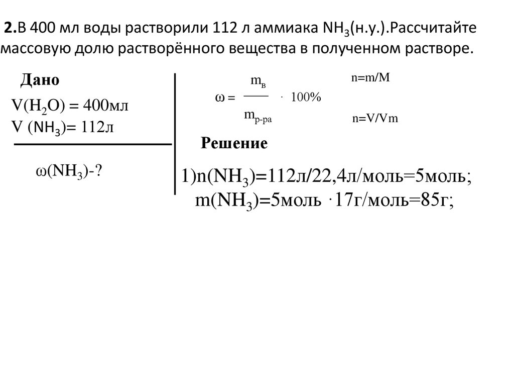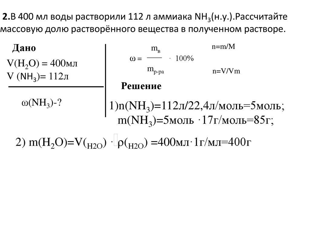 2.В 400 мл воды растворили 112 л аммиака NH3(н.у.).Рассчитайтемассовую долю растворённого вещества в полученном растворе.