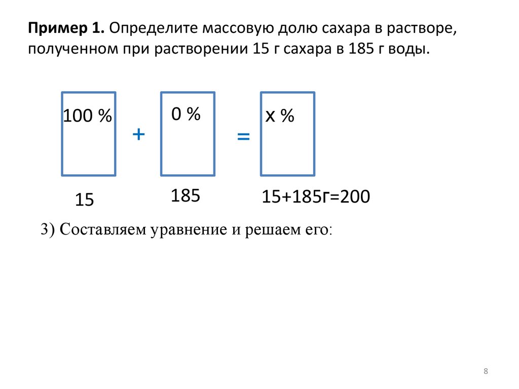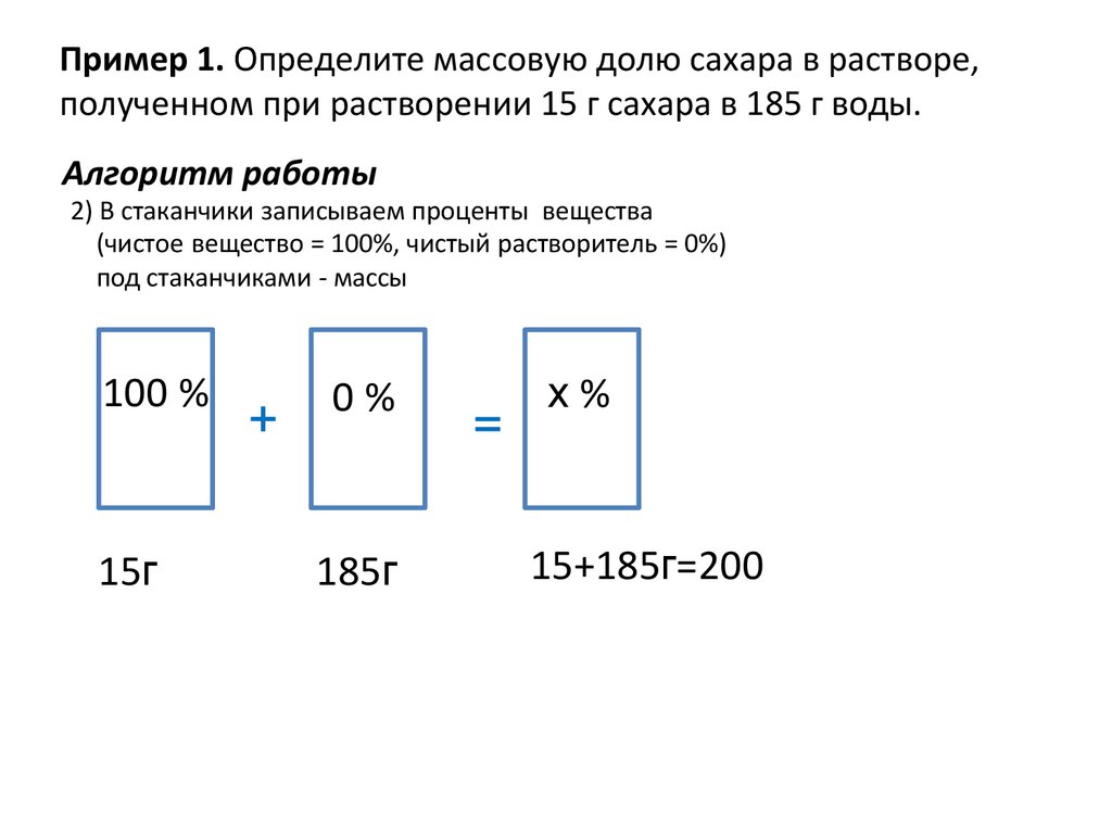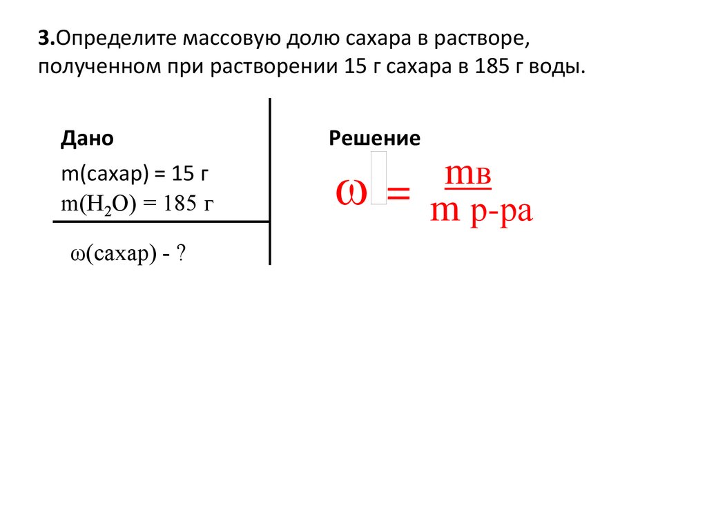 Пример 1. Определите массовую долю сахара в растворе,полученном при растворении 15 г сахара в 185 г воды.