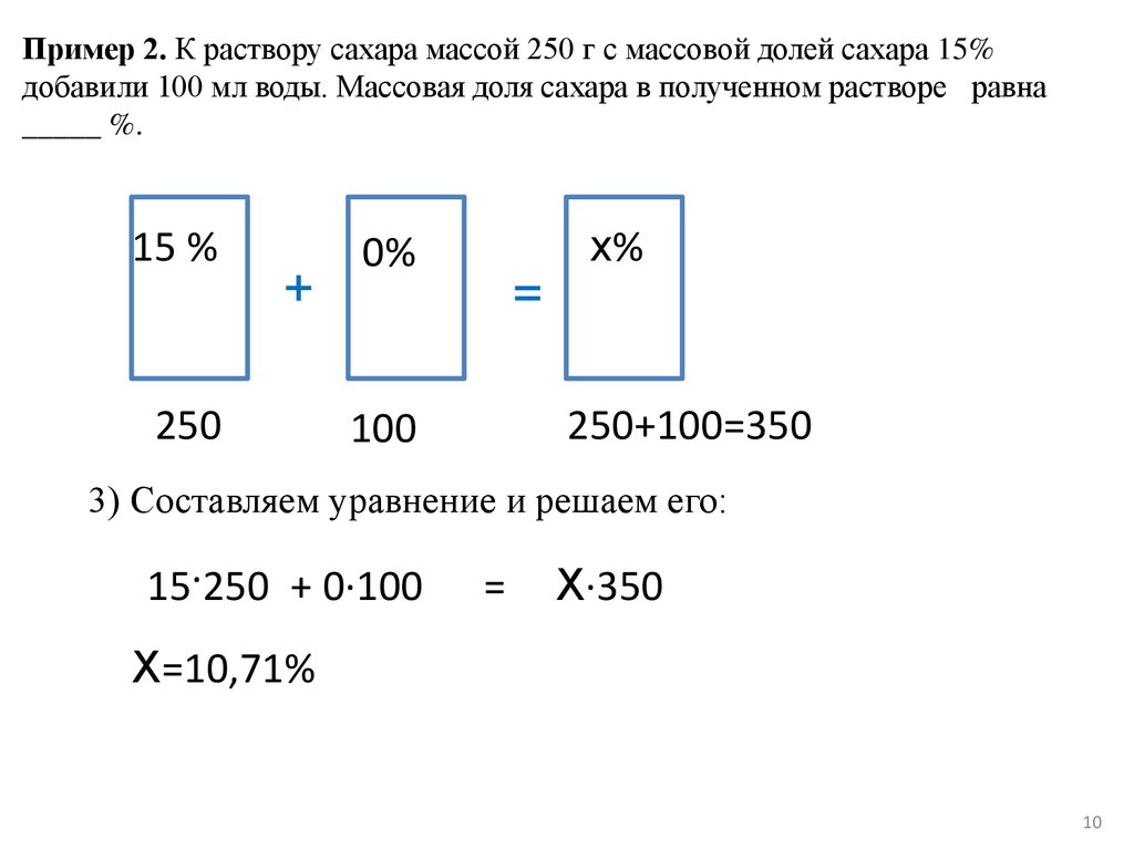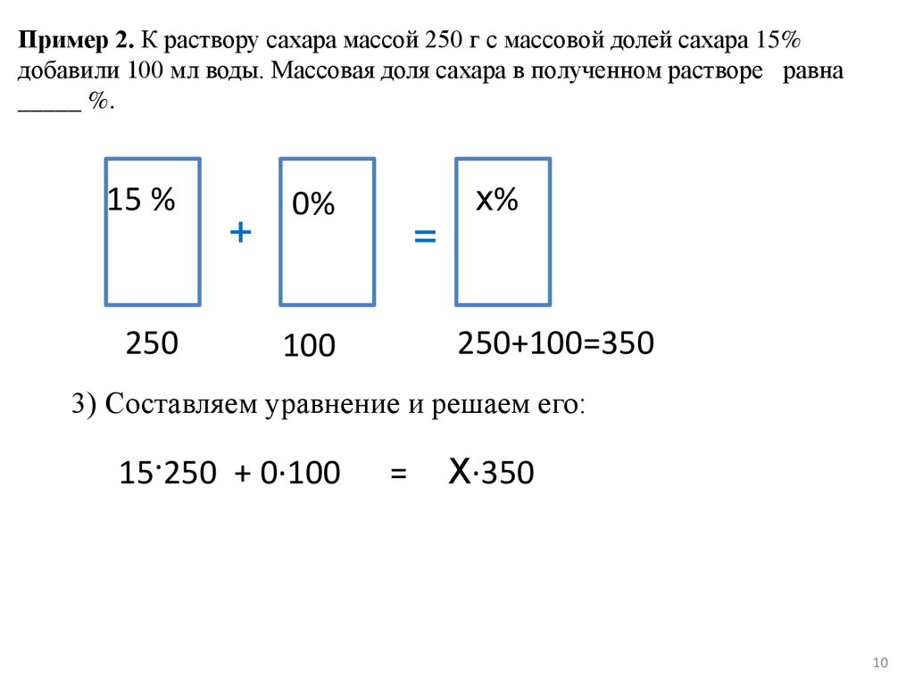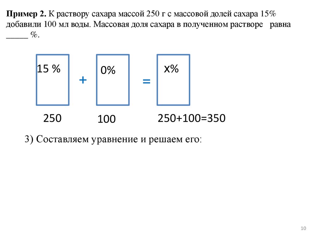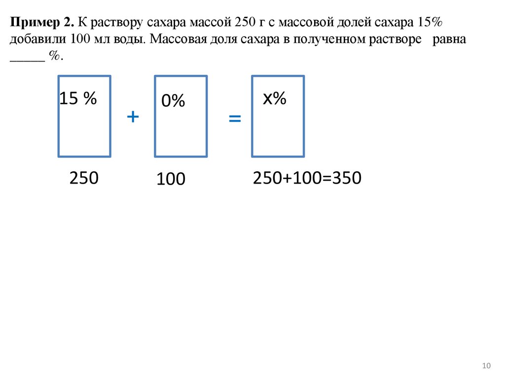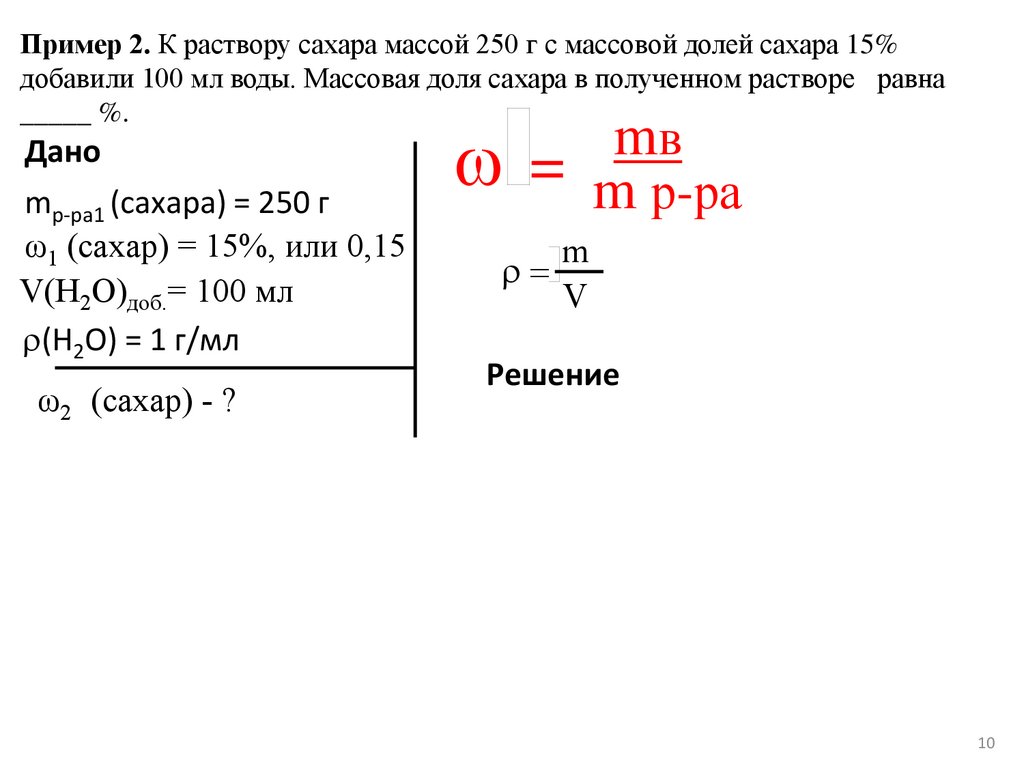 Пример 2. К раствору сахара массой 250 г с массовой долей сахара 15%добавили 100 мл воды. Массовая доля сахара в полученном растворе равна