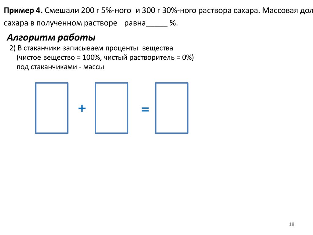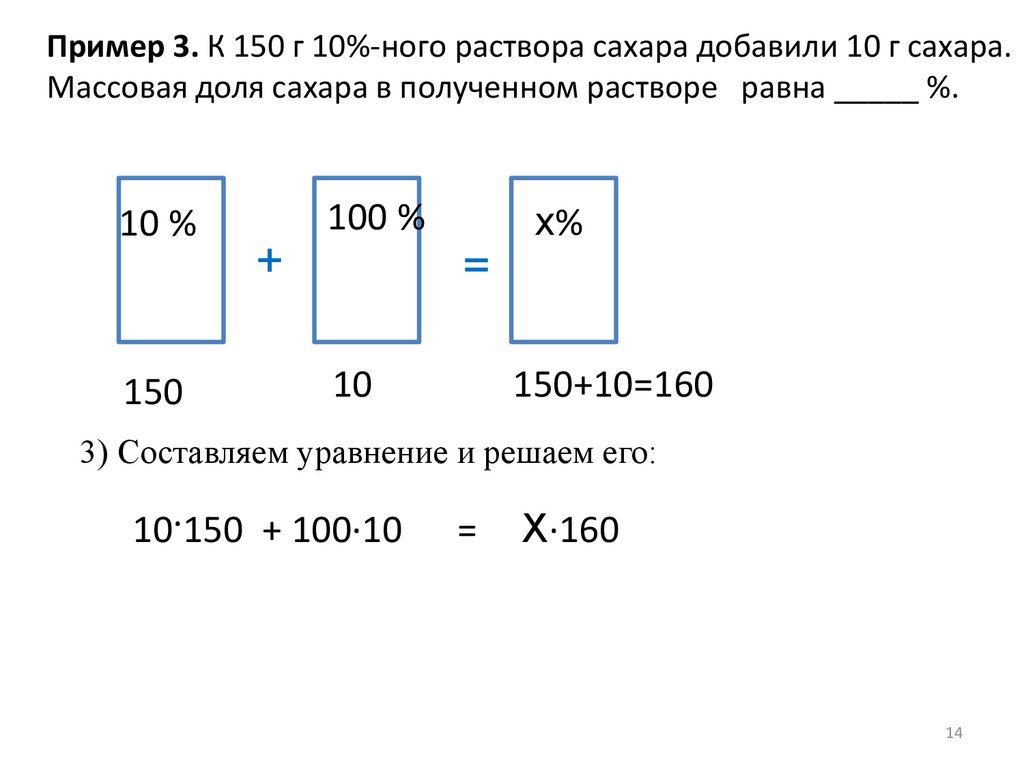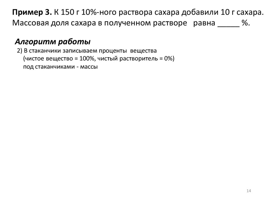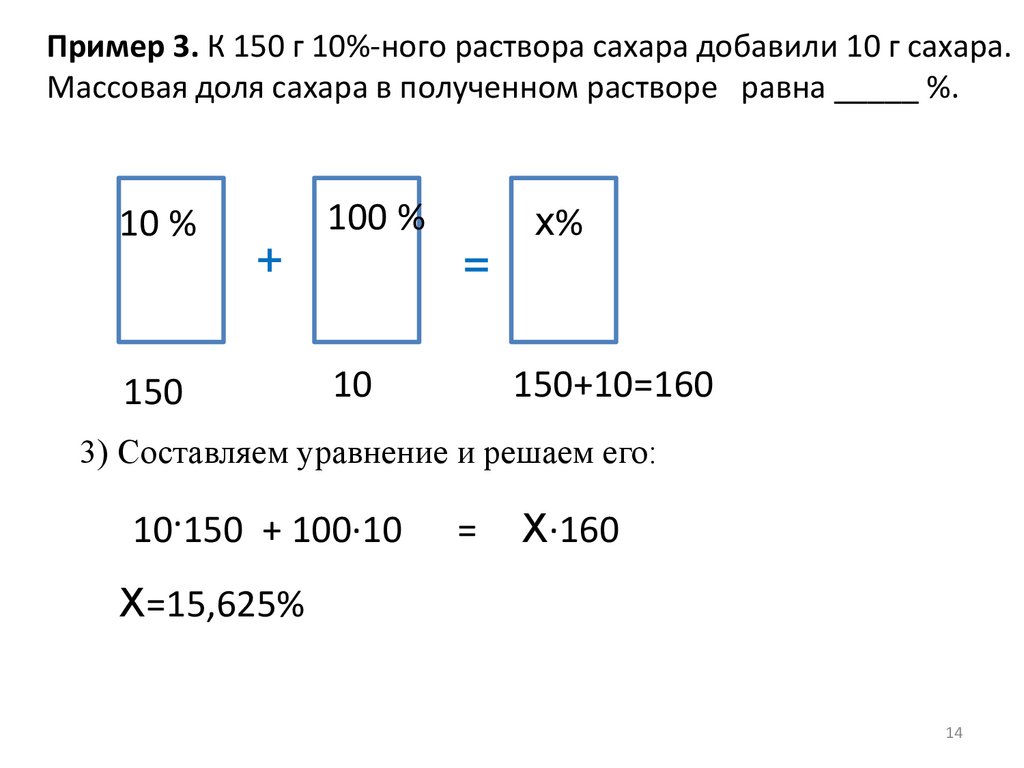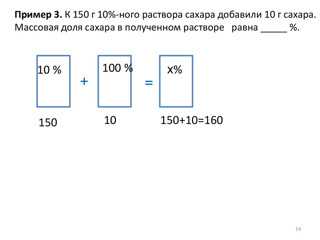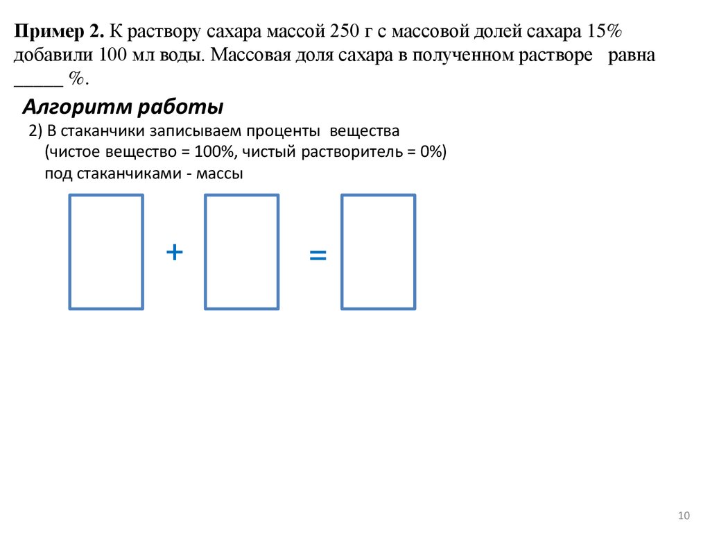 Пример 2. К раствору сахара массой 250 г с массовой долей сахара 15%добавили 100 мл воды. Массовая доля сахара в полученном растворе равна