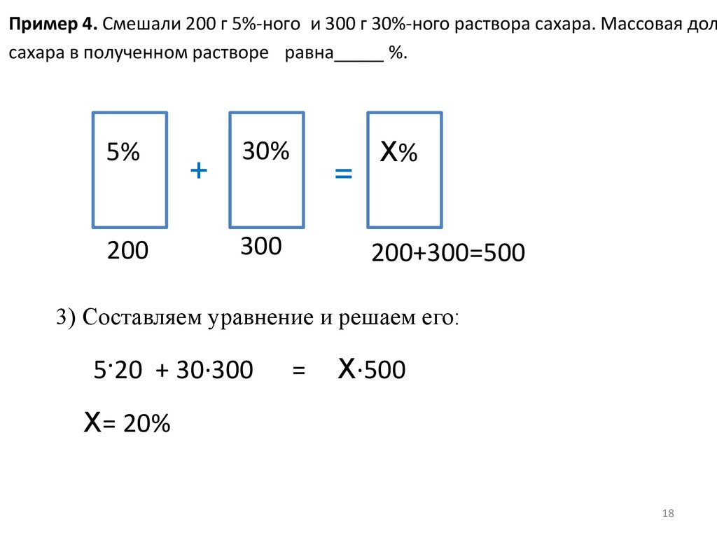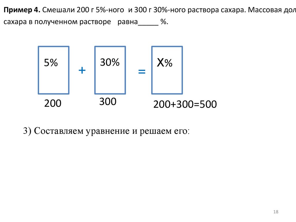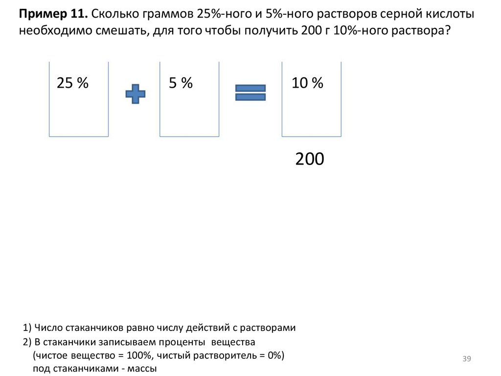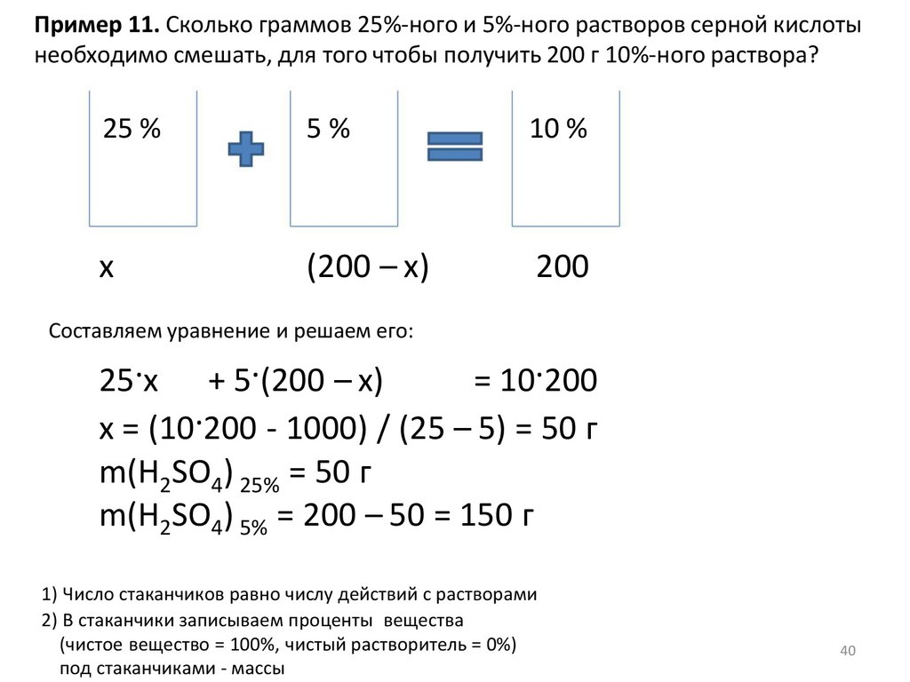 Пример 11. Сколько граммов 25%-ного и 5%-ного растворов серной кислотынеобходимо смешать, для того чтобы получить 200 г 10%-ного раствора?