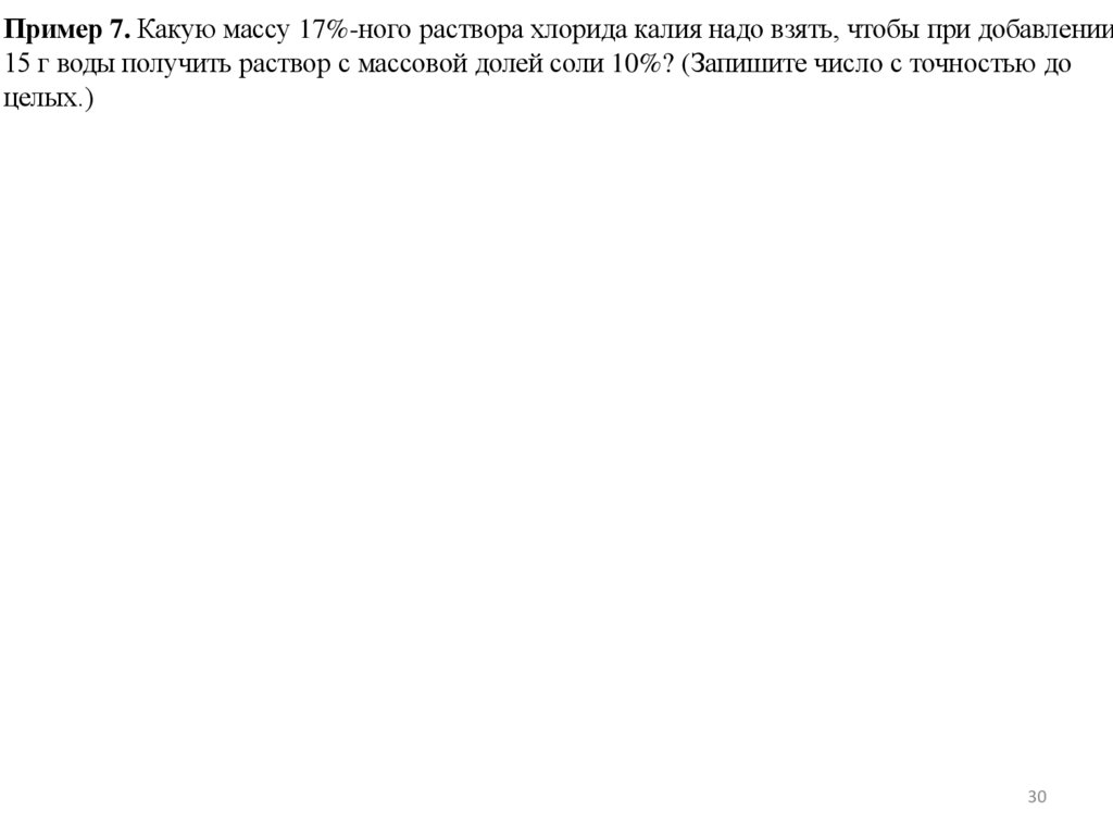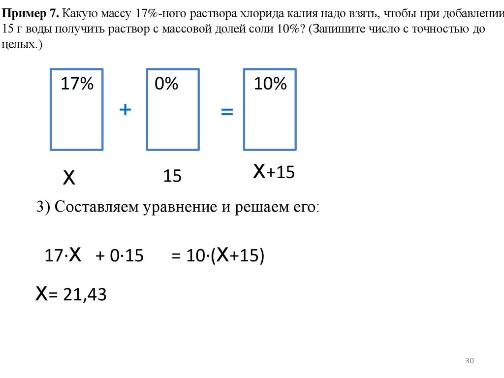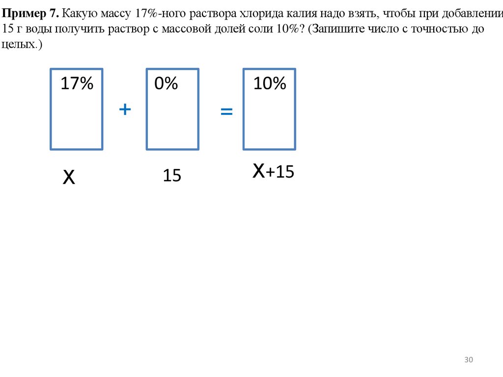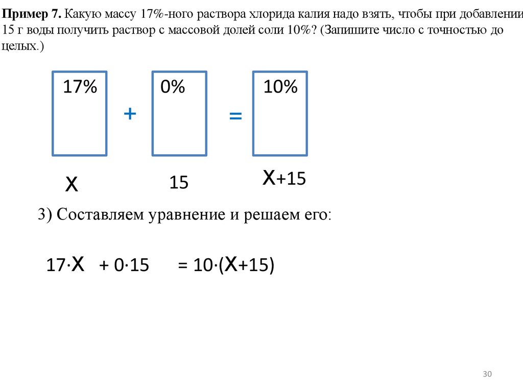 Пример 7а. Какую массу 17%-ного раствора хлорида калия надо взять, чтобы придобавлении 15 г воды получить раствор с массовой долей соли 10%? (Запишите