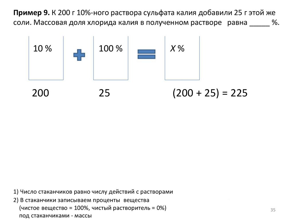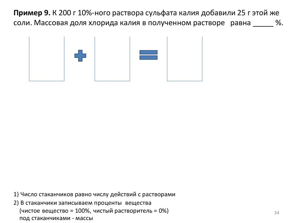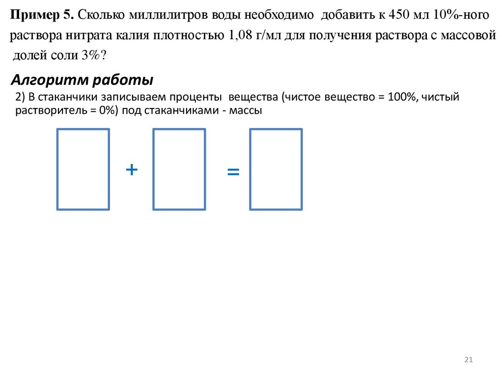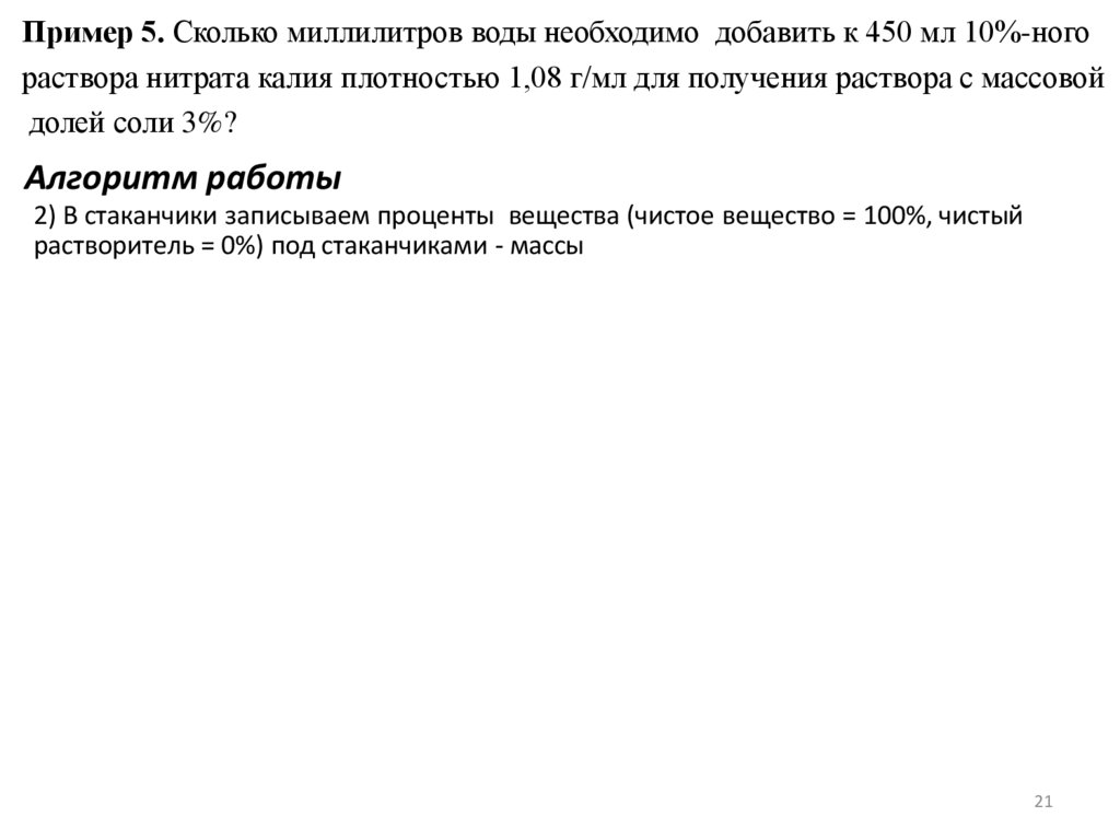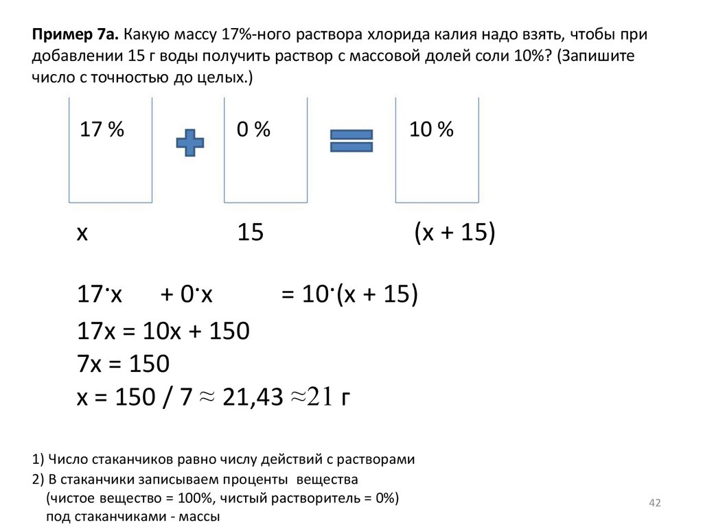 Пример 7а. Какую массу 17%-ного раствора хлорида калия надо взять, чтобы придобавлении 15 г воды получить раствор с массовой долей соли 10%? (Запишите