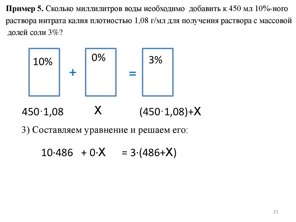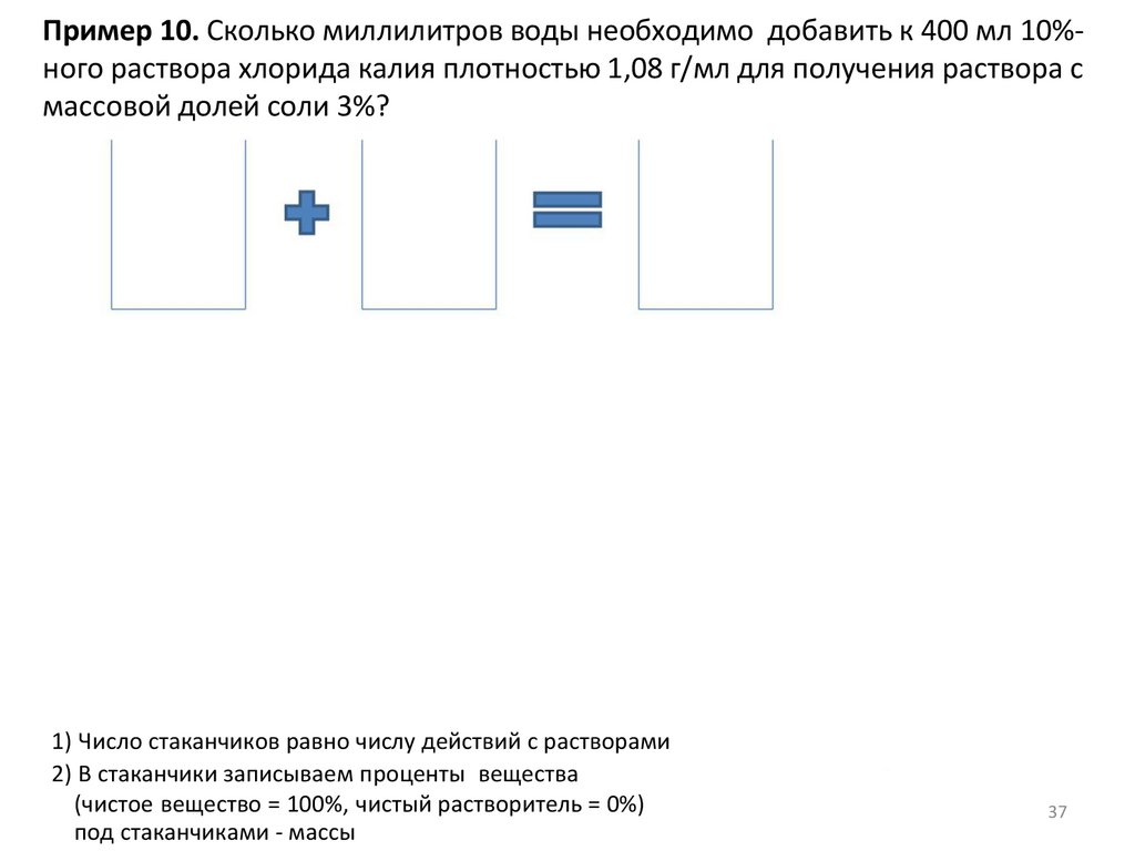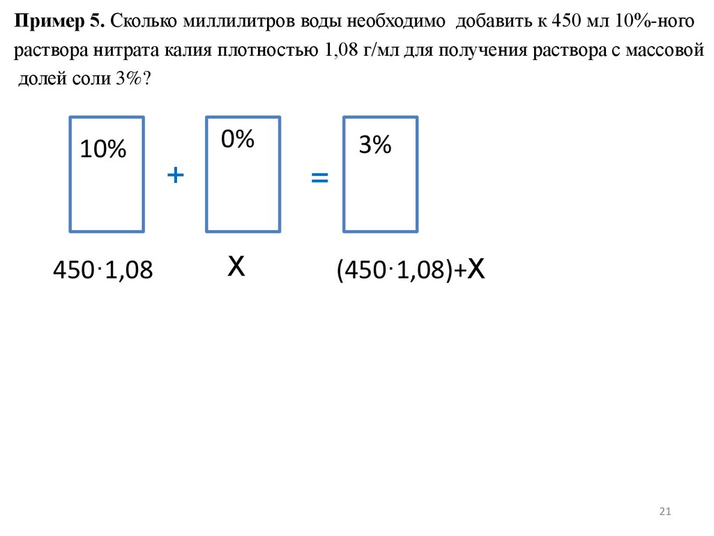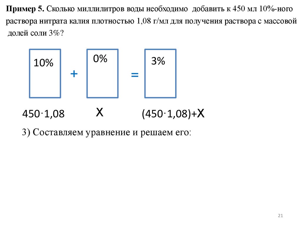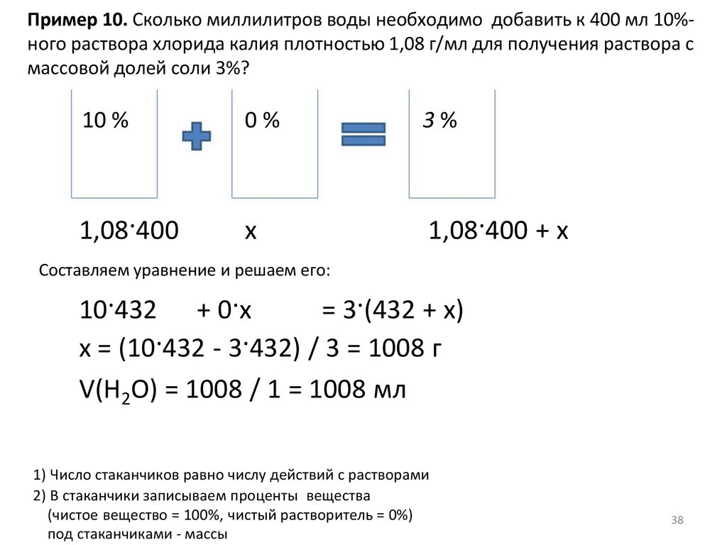 Пример 10. Сколько миллилитров воды необходимо добавить к 400 мл 10%ного раствора хлорида калия плотностью 1,08 г/мл для получения раствора смассовой долей соли 3%?