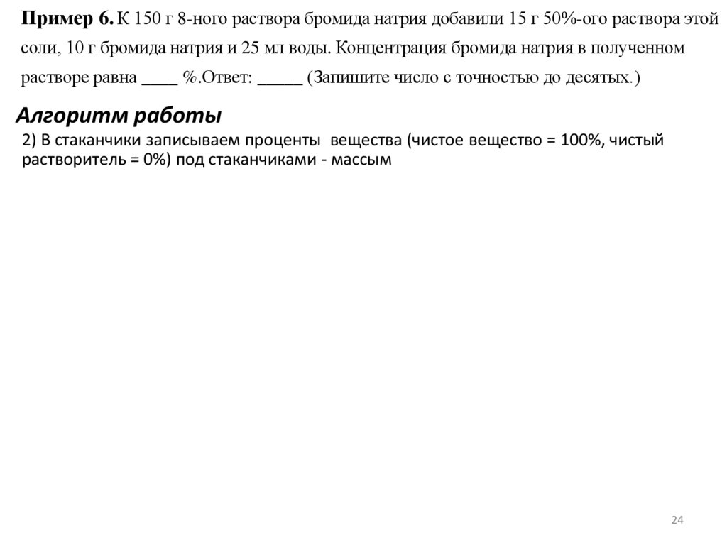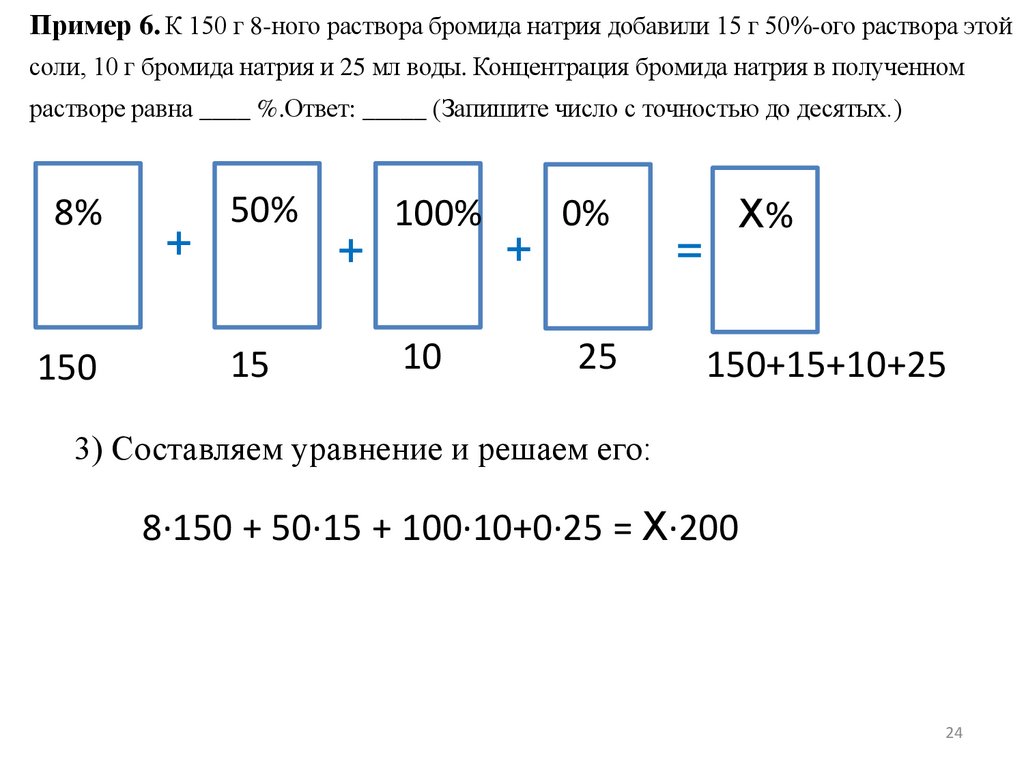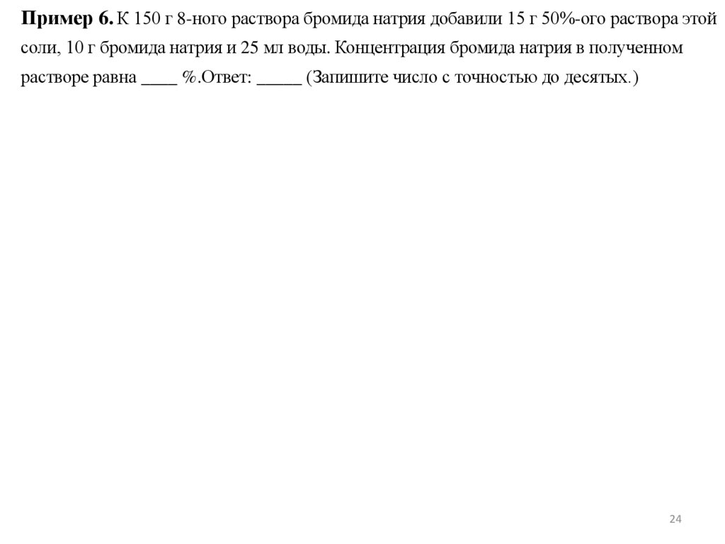 Пример 6. К 150 г 8-ного раствора бромида натрия добавили 15 г 50%-ого раствора этойсоли, 10 г бромида натрия и 25 мл воды. Концентрация бромида натрия в полученном