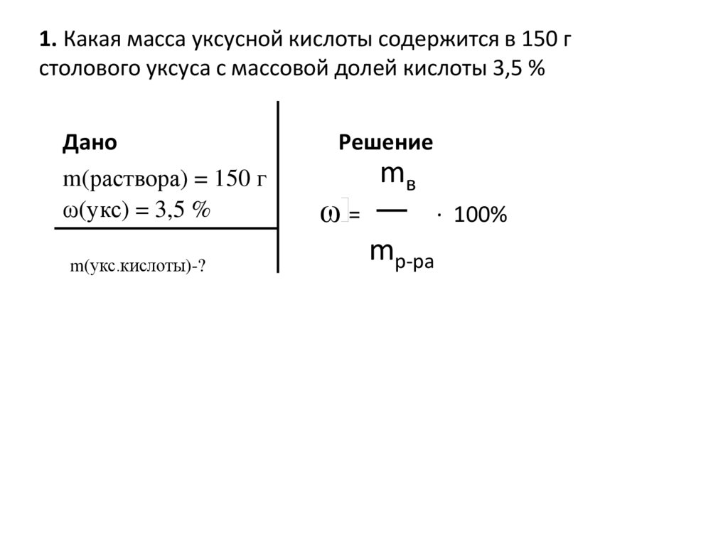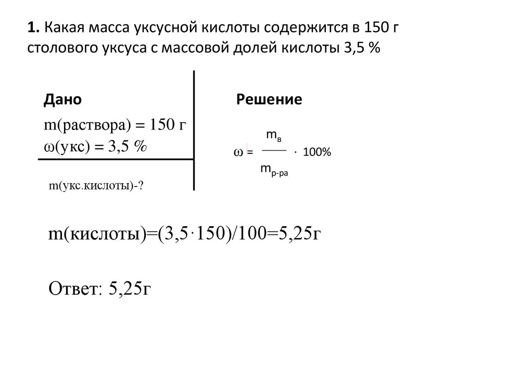 1. Какая масса уксусной кислоты содержится в 150 гстолового уксуса с массовой долей кислоты 3,5 %
