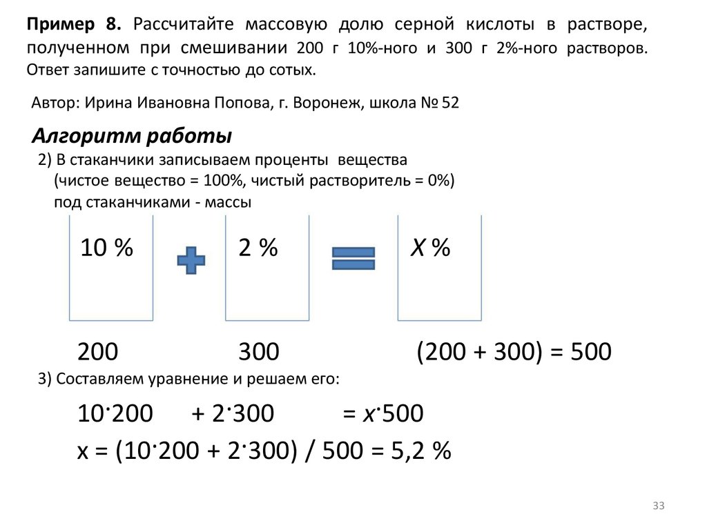 Пример 8. Рассчитайте массовую долю серной кислоты в растворе,полученном при смешивании 200 г 10%-ного и 300 г 2%-ного растворов.