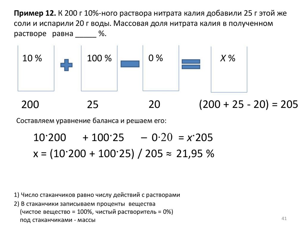 Пример 12. К 200 г 10%-ного раствора нитрата калия добавили 25 г этой жесоли и испарили 20 г воды. Массовая доля нитрата калия в полученном