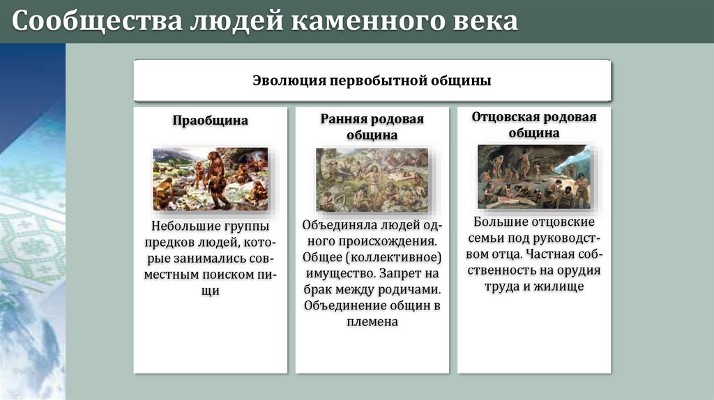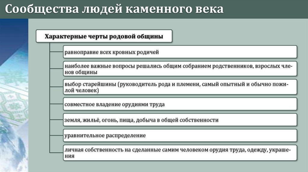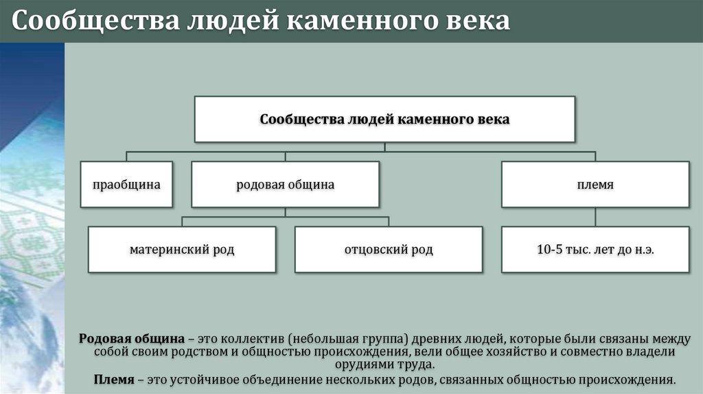 формирование родовой общины (коллектив древних людей, которые были связаны между собой своим родством и общностью происхождения, вели общее хозяйство и совместно владели орудиями труда)