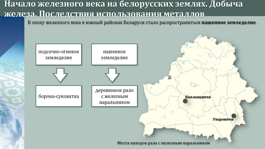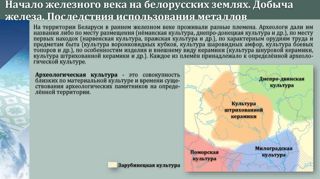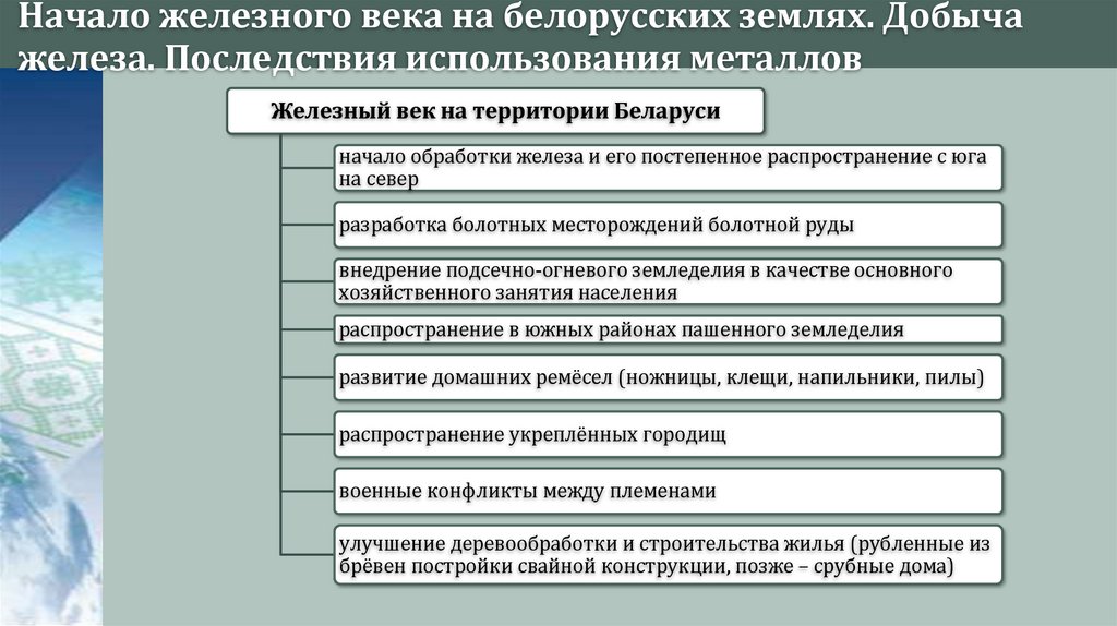 ➢ Начало железного века на белорусских землях. Добыча железа. Последствия использования металлов.