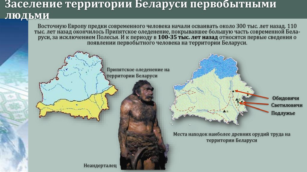 тыс. лет назад окончилось Припятское оледенение, покрывавшее большую часть современной Беларуси, за исключением Полесья. И к периоду в 100-35 тыс. лет назад относятся первые сведения о