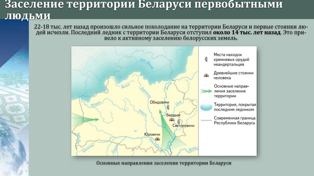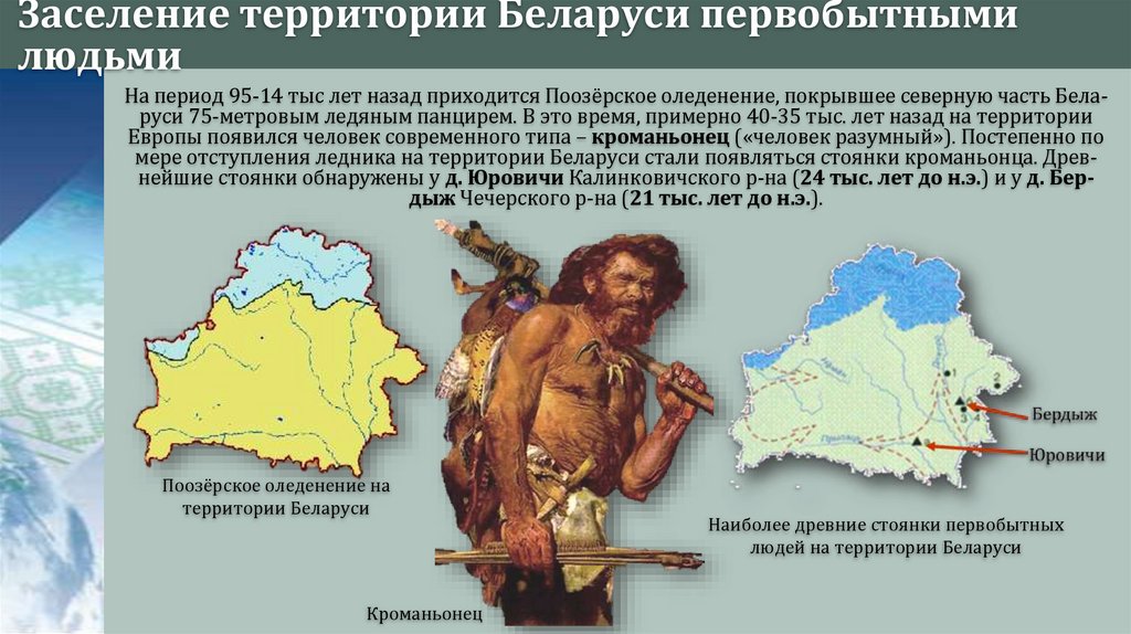 мере отступления ледника на территории Беларуси стали появляться стоянки кроманьонца. Древнейшие стоянки обнаружены у д. Юровичи Калинковичского р-на (24 тыс. лет до н.э.) и у д. Бердыж Чечерского р-на (21 тыс. лет до н.э.).