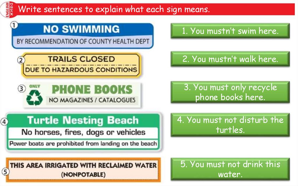 Write sentences to explain what each sign means.1. You mustn’t swim here.