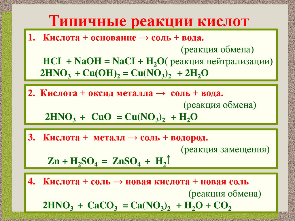 Типичные реакции кислот1. Кислота + основание → соль + вода.