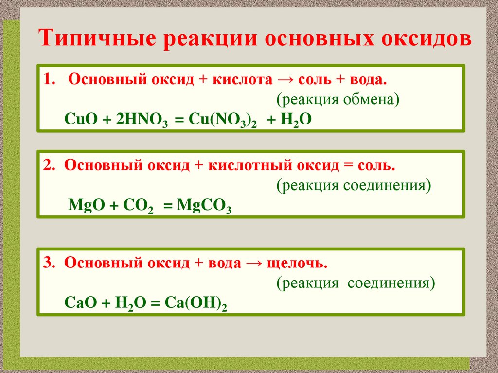 Типичные реакции основных оксидов1. Основный оксид + кислота → соль + вода.