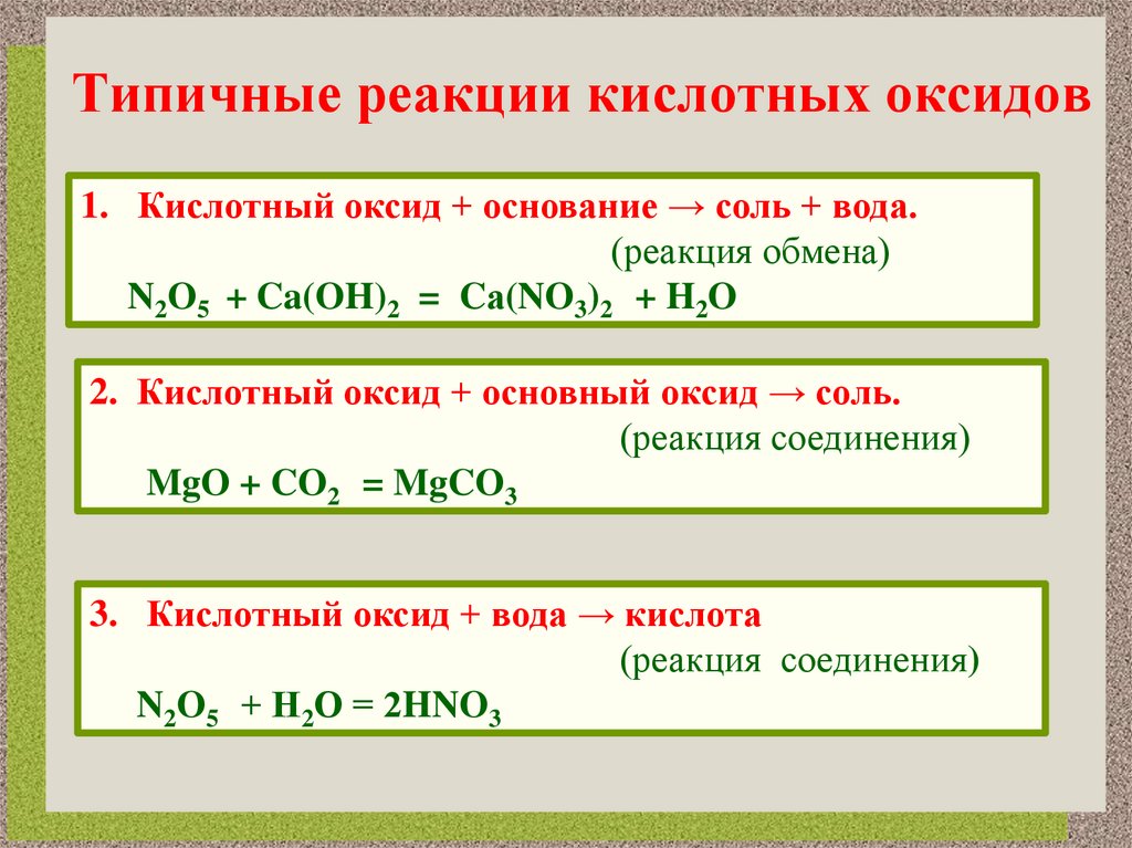 Типичные реакции кислотных оксидов1. Кислотный оксид + основание → соль + вода.