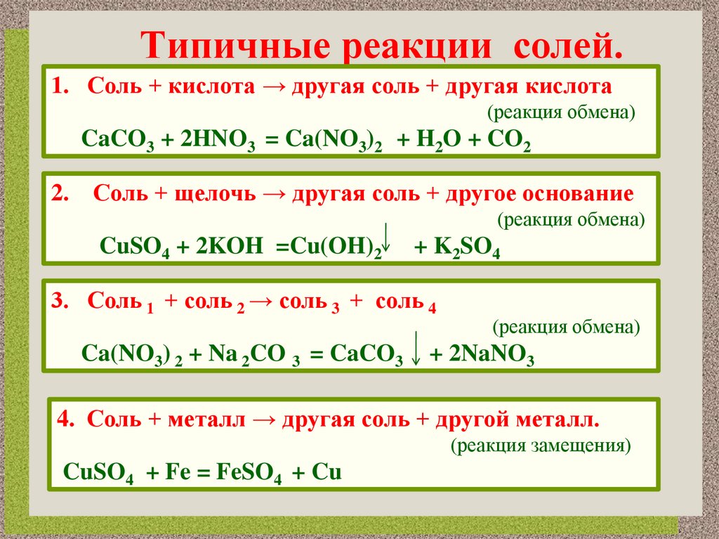 Типичные реакции солей.1. Соль + кислота → другая соль + другая кислота