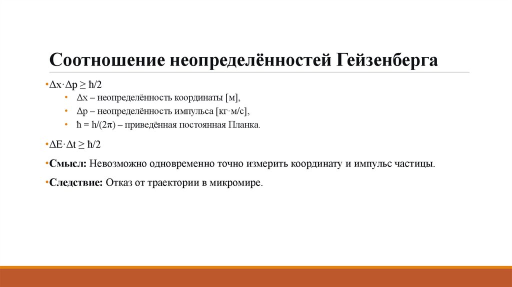 Соотношение неопределённостей Гейзенберга•Δx·Δp ≥ ħ/2