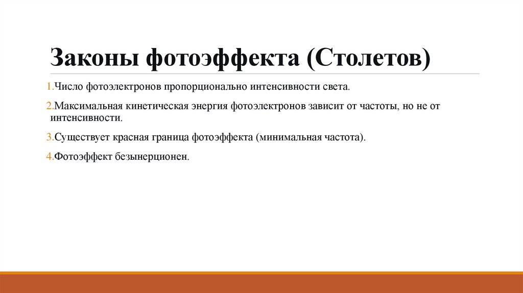 Законы фотоэффекта (Столетов)1.Число фотоэлектронов пропорционально интенсивности света.