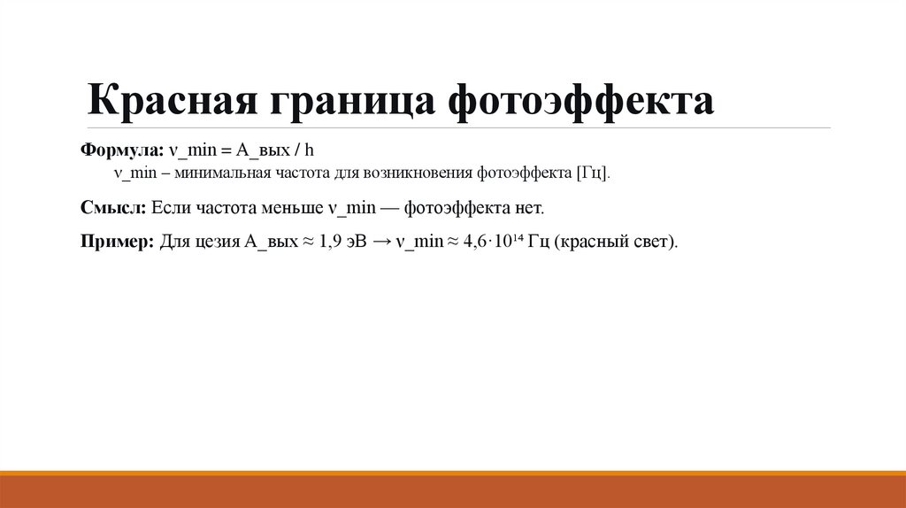 Красная граница фотоэффектаФормула: ν_min = A_вых / h