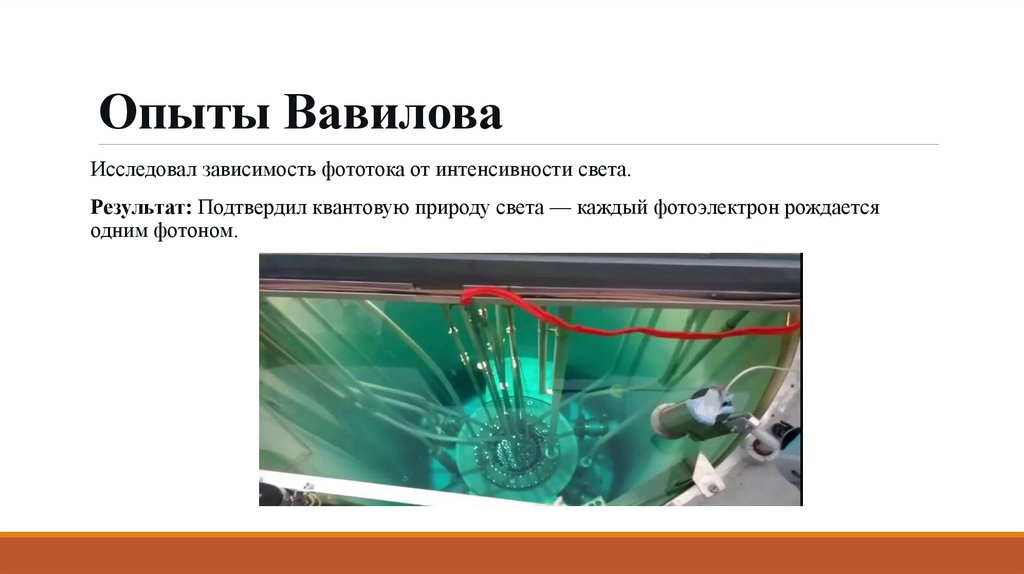 Опыты ВавиловаИсследовал зависимость фототока от интенсивности света.