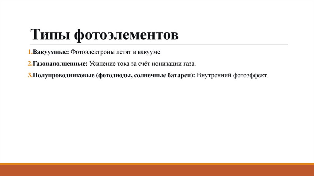 Типы фотоэлементов1.Вакуумные: Фотоэлектроны летят в вакууме.