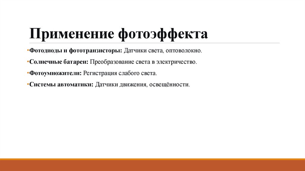 Применение фотоэффекта•Фотодиоды и фототранзисторы: Датчики света, оптоволокно.