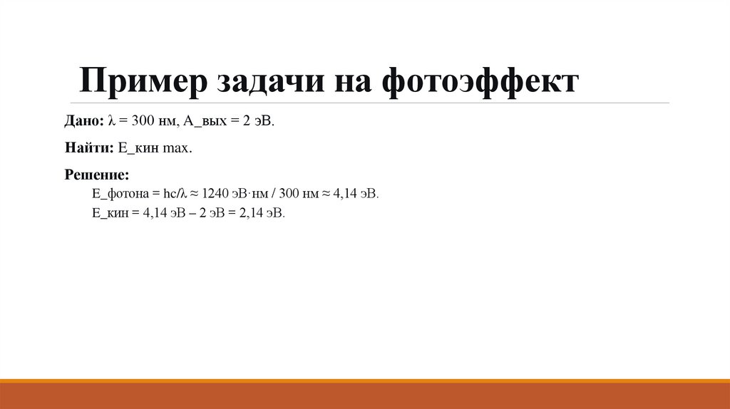 Пример задачи на фотоэффектДано: λ = 300 нм, A_вых = 2 эВ.