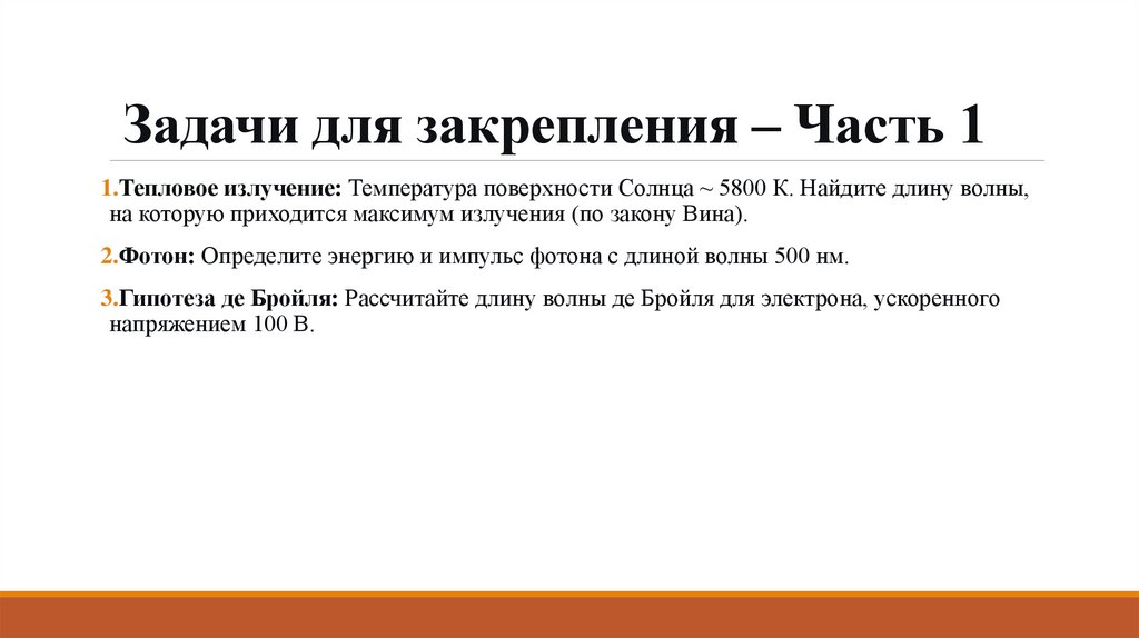 Задачи для закрепления – Часть 11.Тепловое излучение: Температура поверхности Солнца ~ 5800 К. Найдите длину волны,