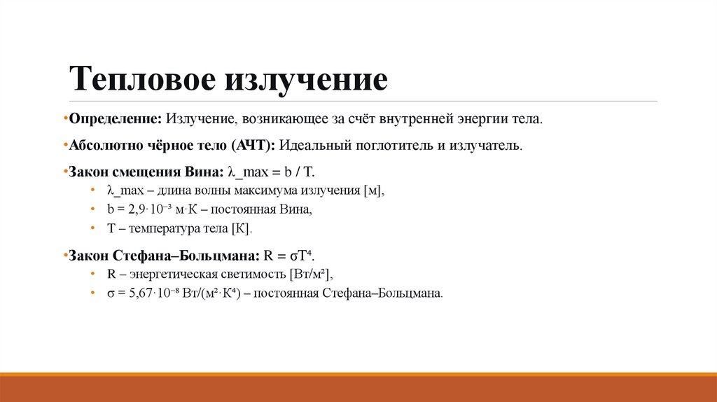 •Абсолютно чёрное тело (АЧТ): Идеальный поглотитель и излучатель.