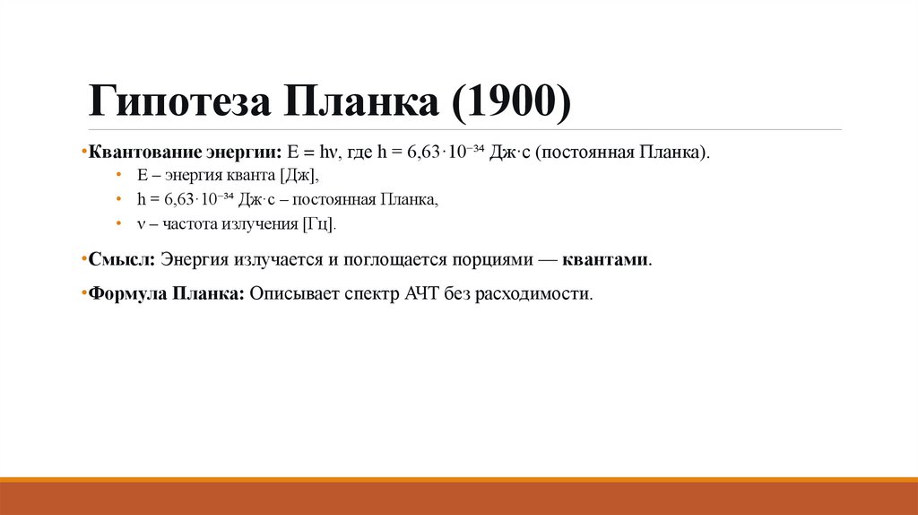 Гипотеза Планка (1900)•Квантование энергии: E = hν, где h = 6,63·10⁻³⁴ Дж·с (постоянная Планка).