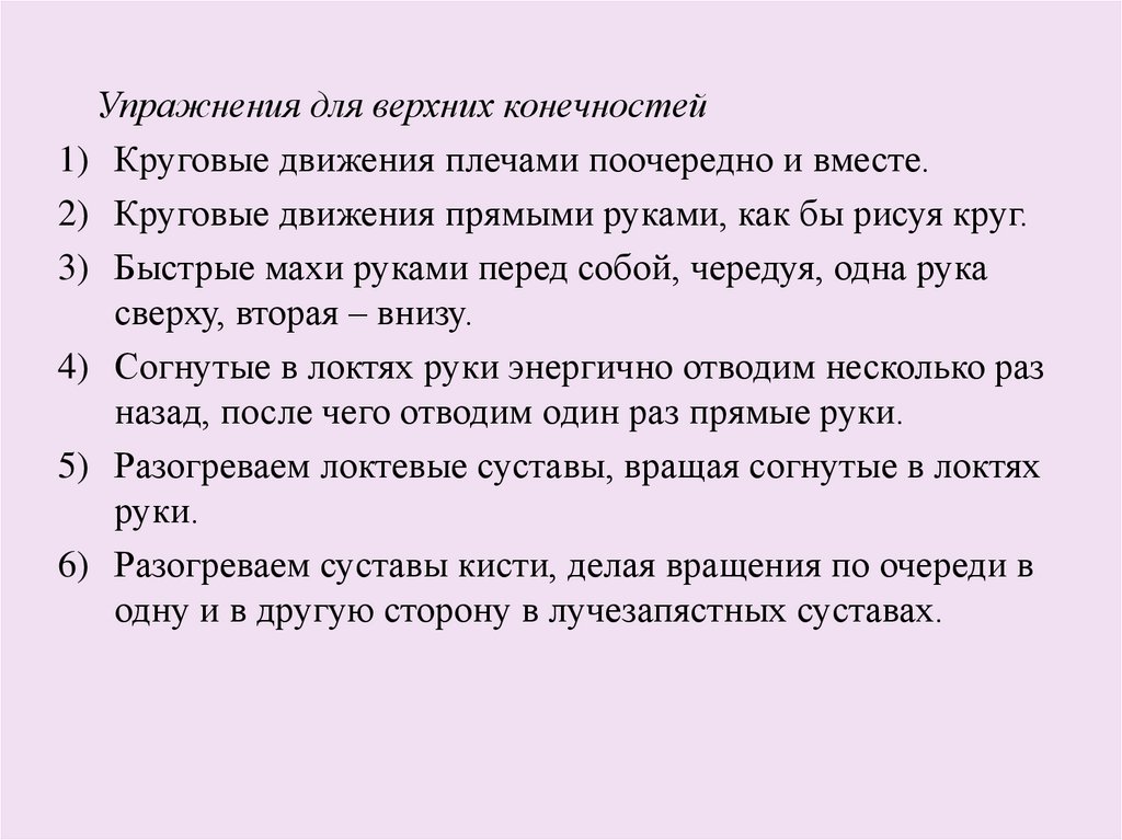 Упражнения для верхних конечностей1) Круговые движения плечами поочередно и вместе.