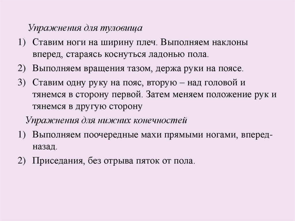Упражнения для туловища1) Ставим ноги на ширину плеч. Выполняем наклоны