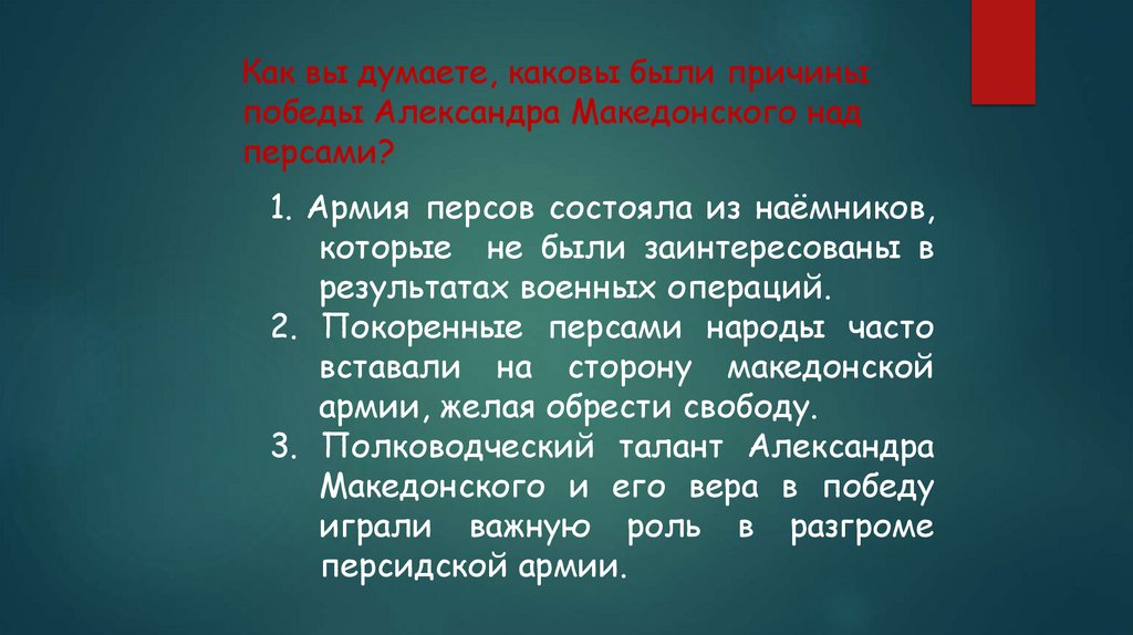 Как вы думаете, каковы были причиныпобеды Александра Македонского над