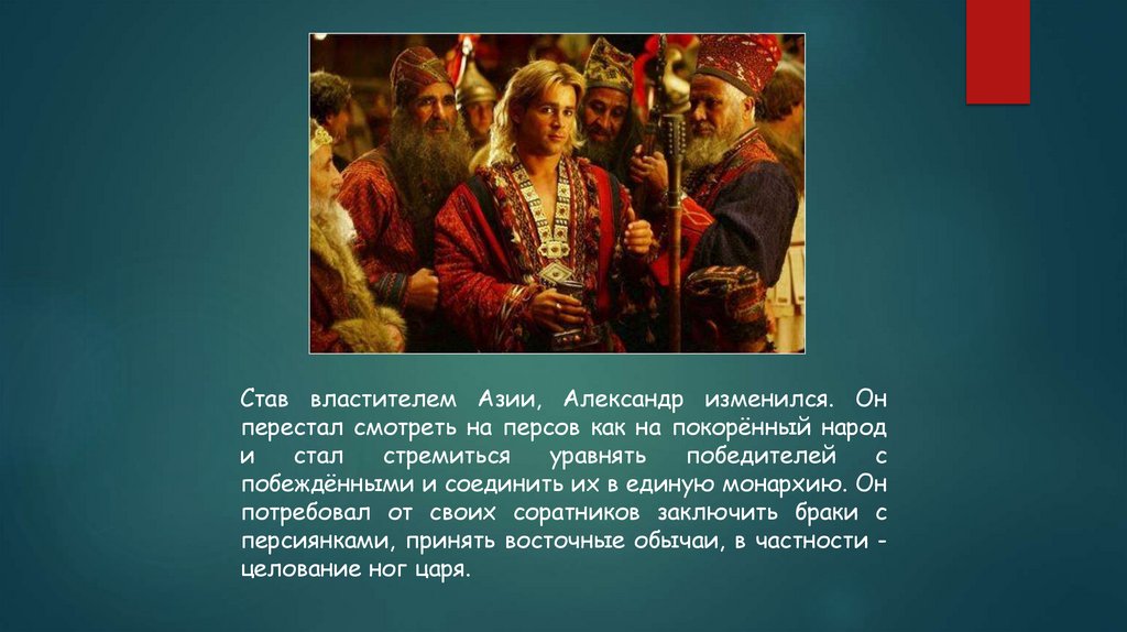 Став властителем Азии, Александр изменился. Онперестал смотреть на персов как на покорённый народ