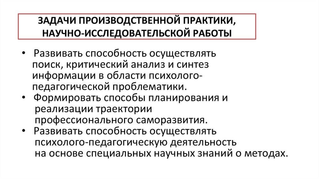 ЗАДАЧИ ПРОИЗВОДСТВЕННОЙ ПРАКТИКИ,НАУЧНО-ИССЛЕДОВАТЕЛЬСКОЙ РАБОТЫ