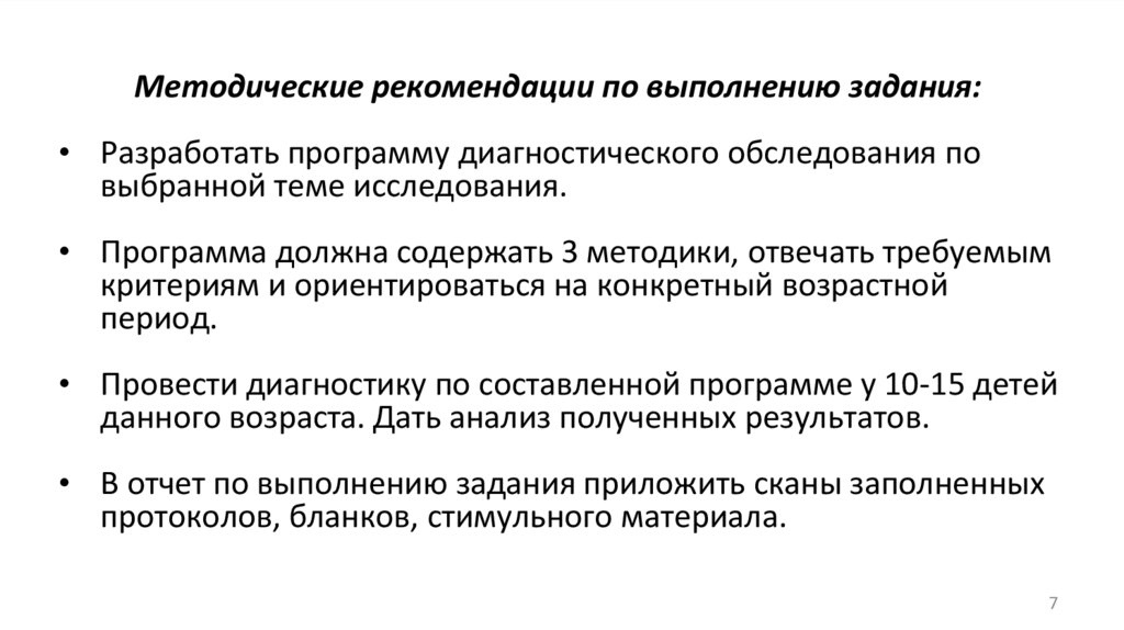 Методические рекомендации по выполнению задания:• Разработать программу диагностического обследования по