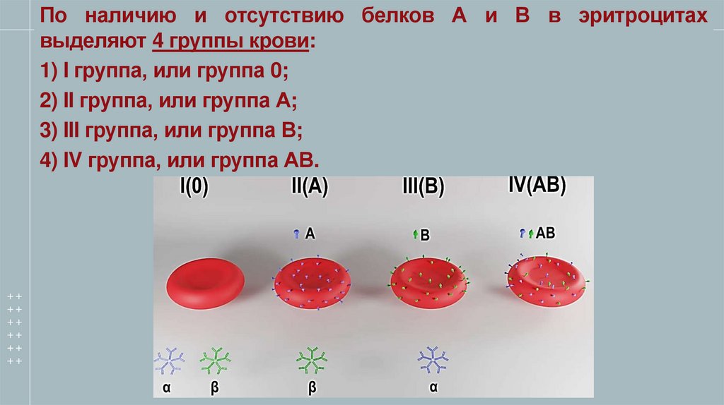 По наличию и отсутствию белков А и В в эритроцитахвыделяют 4 группы крови:
