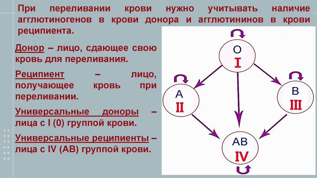 При переливании крови нужно учитывать наличиеагглютиногенов в крови донора и агглютининов в крови