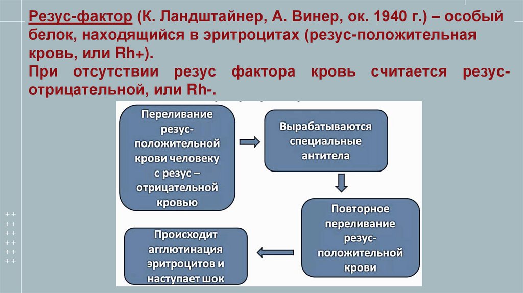 Резус-фактор (К. Ландштайнер, А. Винер, ок. 1940 г.) – особыйбелок, находящийся в эритроцитах (резус-положительная