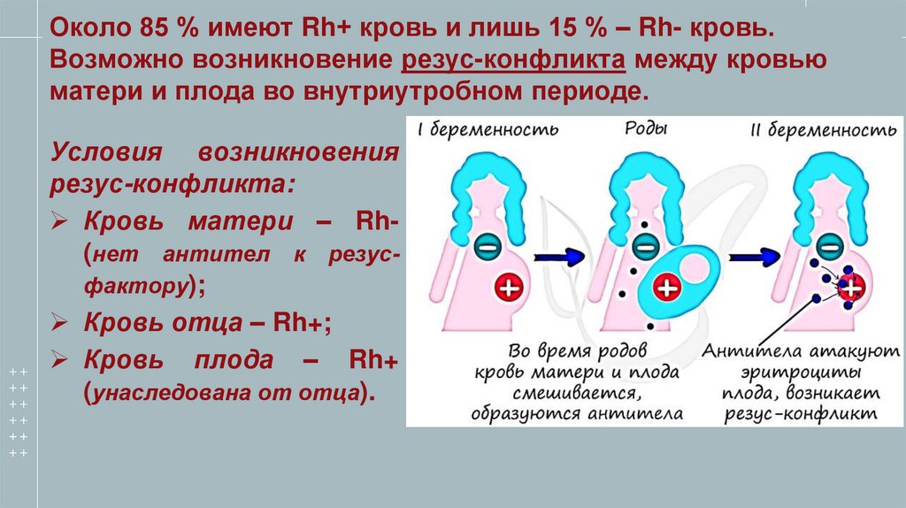 Около 85 % имеют Rh+ кровь и лишь 15 % – Rh- кровь.Возможно возникновение резус-конфликта между кровью