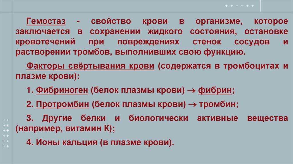 Гемостаз - свойство крови в организме, котороезаключается в сохранении жидкого состояния, остановке