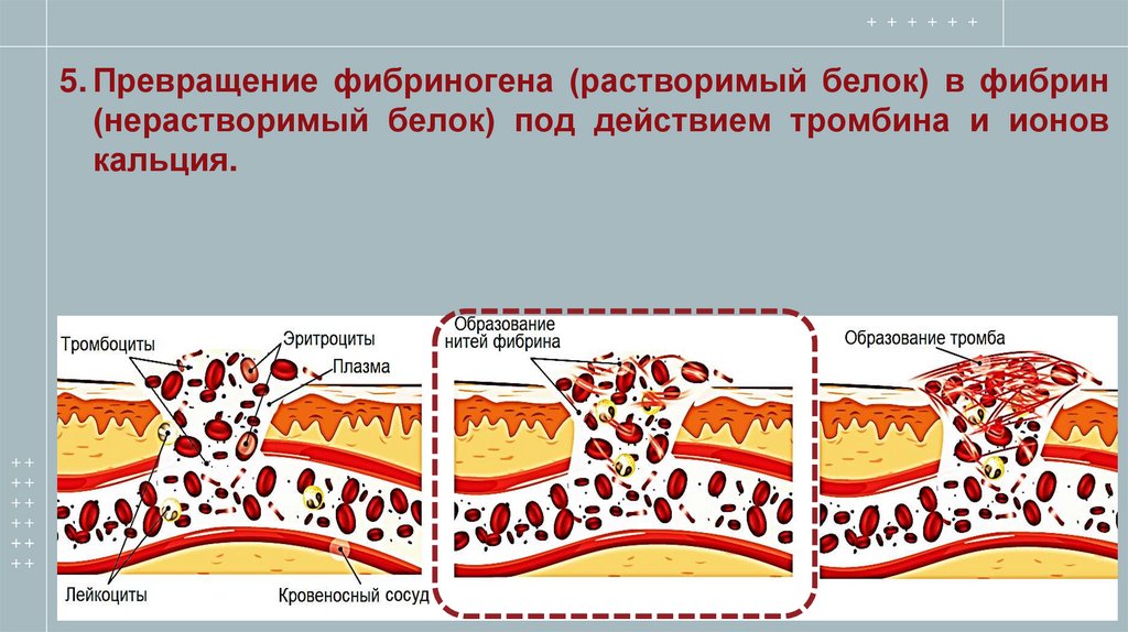 5. Превращение фибриногена (растворимый белок) в фибрин(нерастворимый белок) под действием тромбина и ионов