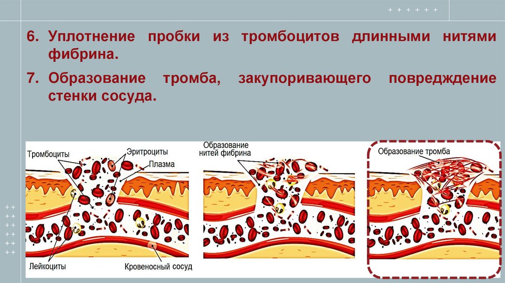 6. Уплотнение пробки из тромбоцитов длинными нитямифибрина.