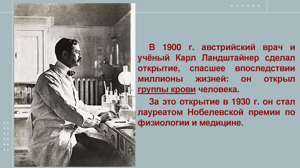 В 1900 г. австрийский врач иучёный Карл Ландштайнер сделал