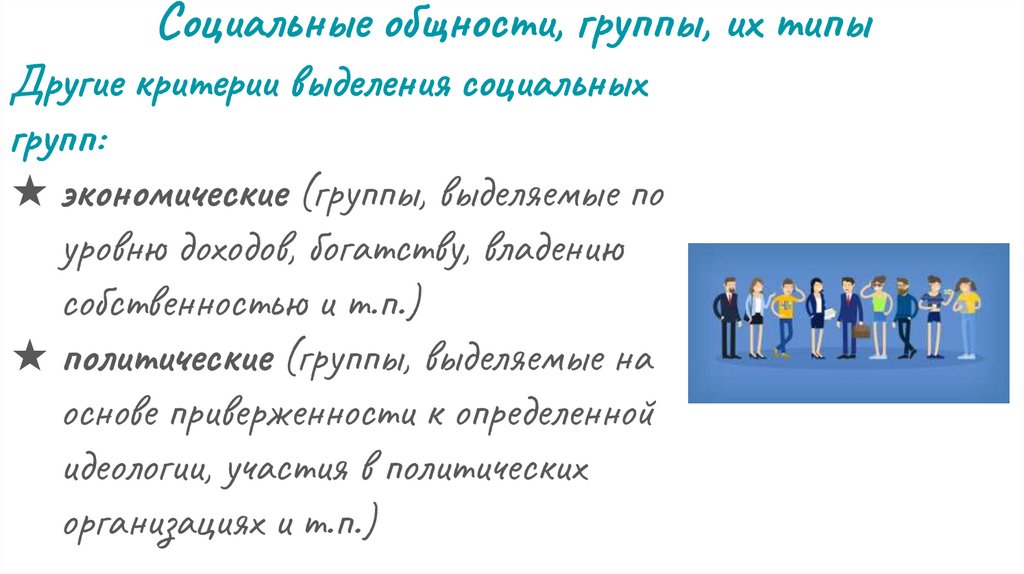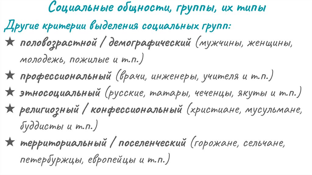 Социальные общности, группы, их типыДругие критерии выделения социальных групп: