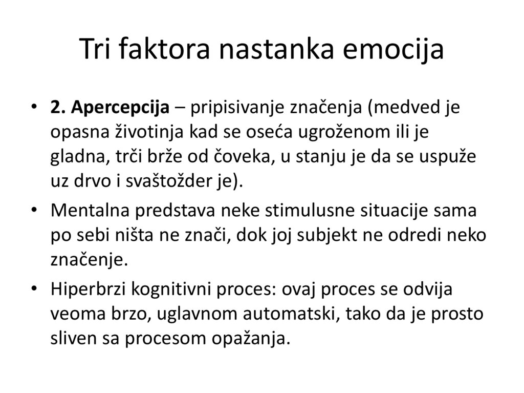 Tri faktora nastanka emocija• 2. Apercepcija – pripisivanje značenja (medved je