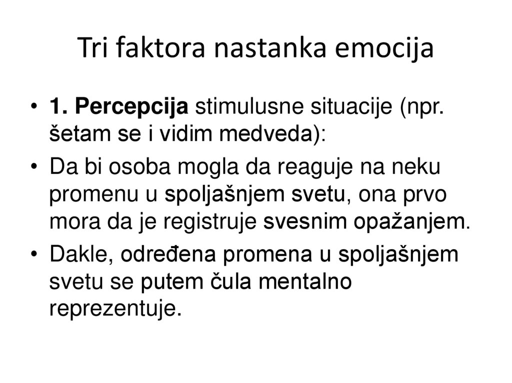 Tri faktora nastanka emocija• 1. Percepcija stimulusne situacije (npr.